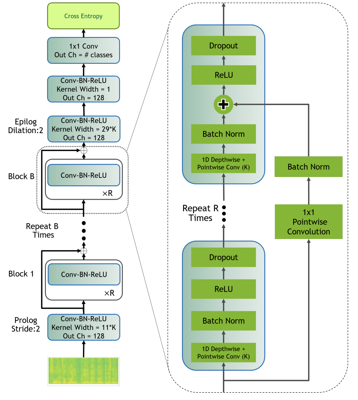 MatchboxNet [SC-MODELS2] is an end-to-end neural network for speech command recognition based on QuartzNet.